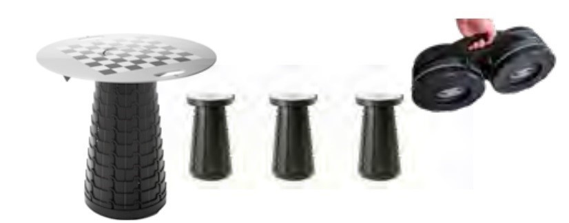 Ensemble de 4 tabourets rétractables dont un tabouret pouvant être transformé en table.• Tabouret et table : Hauteur 7 à 45 cm• Plateau de table : Ø 50 cm• 5,1 kg